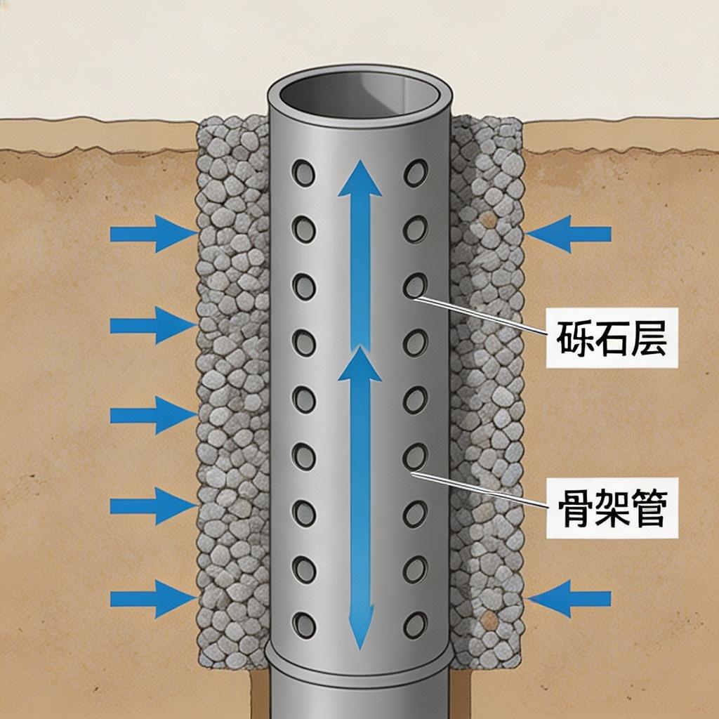 整体为复合结构,砾石层厚度 100-200mm,骨架管为穿孔钢管,整体结构稳定,过滤效果好。