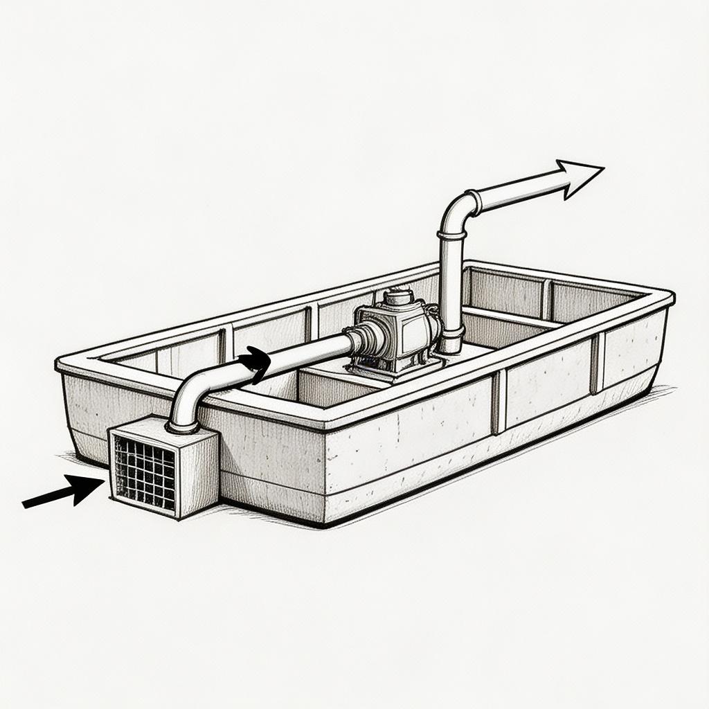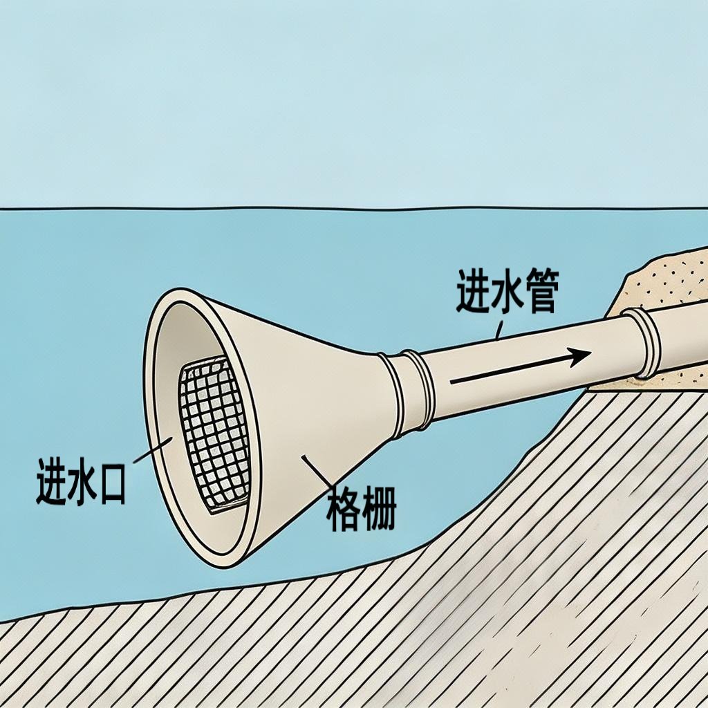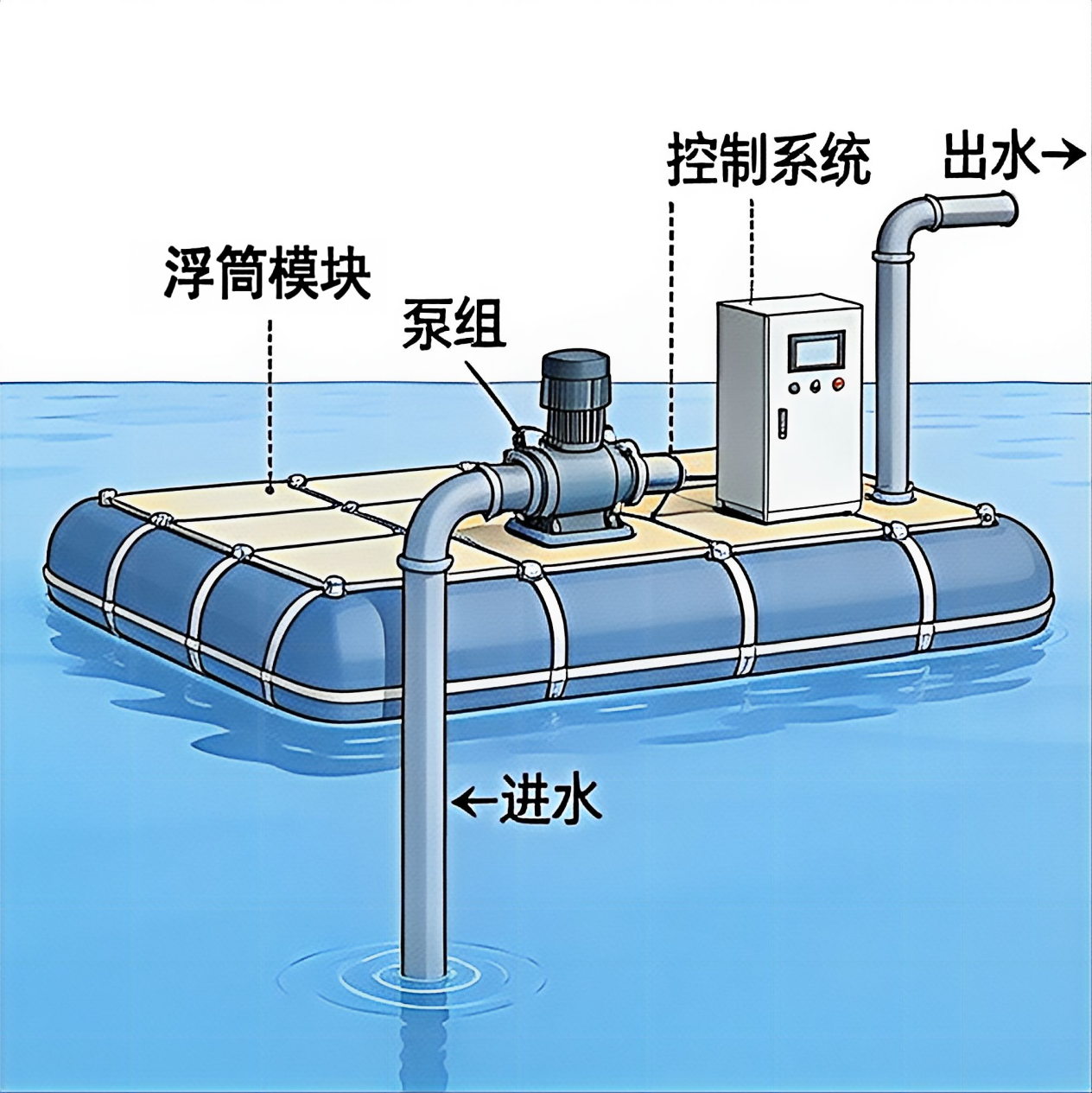 进水口设置不锈钢滤网,位于浮筒下方 0.5-1.5 米深度位置,避免吸入表层杂物。