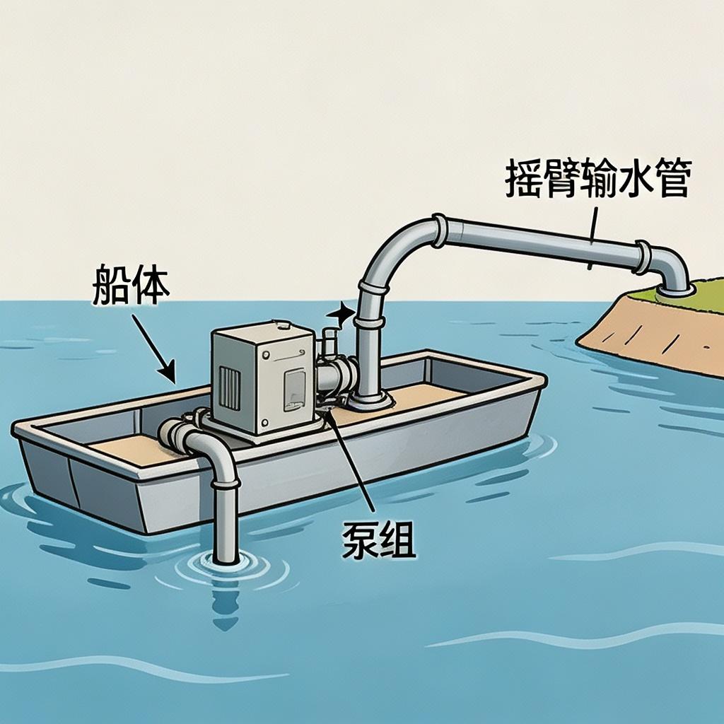 本分类下的器具为移动式的地表水取水船载设备,将取水水泵、泵站集成在船体上,可根据水位变化、取水需求移动取水位置,适配水位变化大、取水需求灵活的场景,无需固定的岸边构筑物,部署灵活,可满足不同位置的取水需求。