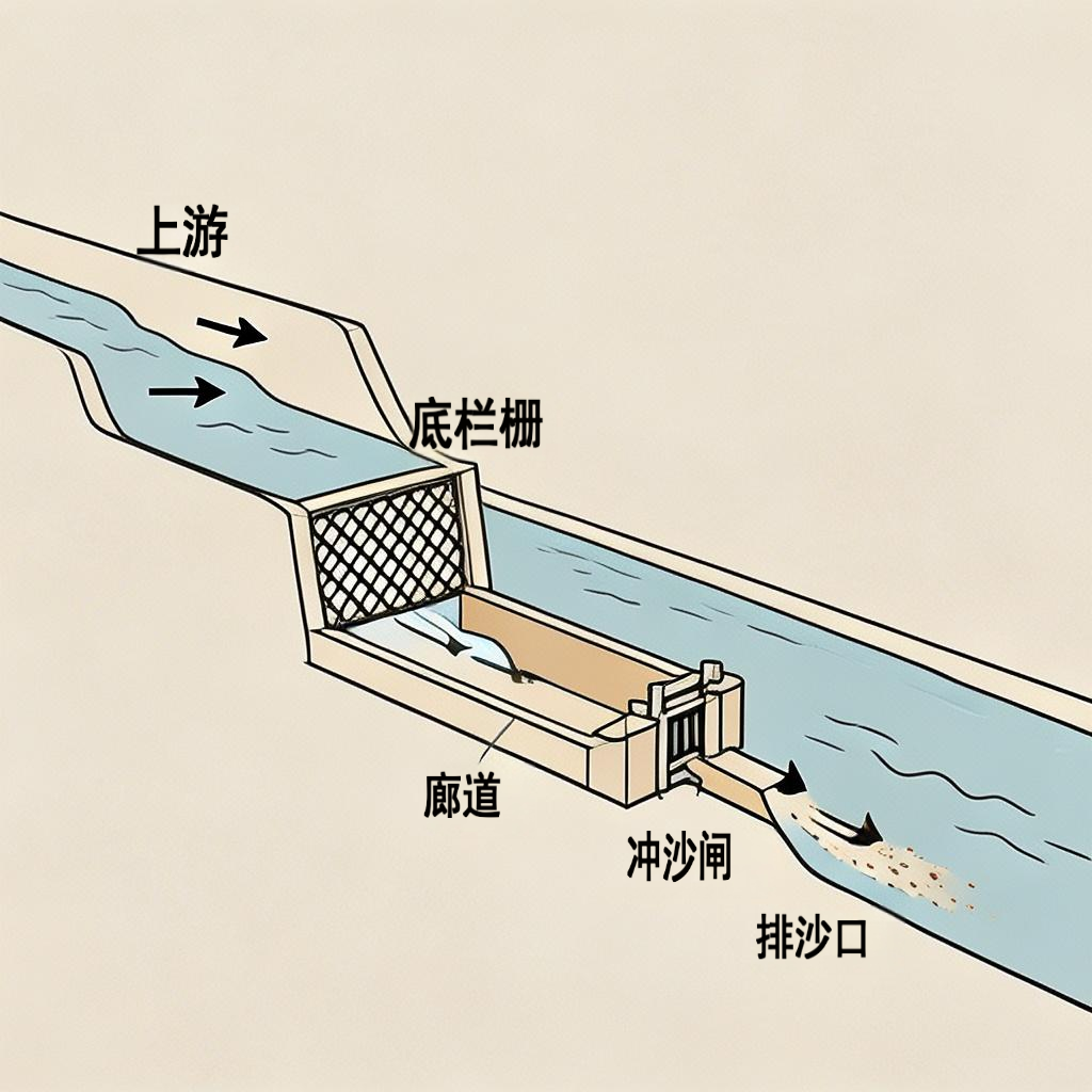 可实现自动的排沙,在汛期开启冲沙闸,利用水流的冲击力,将廊道内的泥沙冲到下游,无需人工清理。