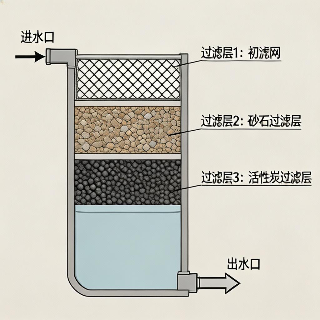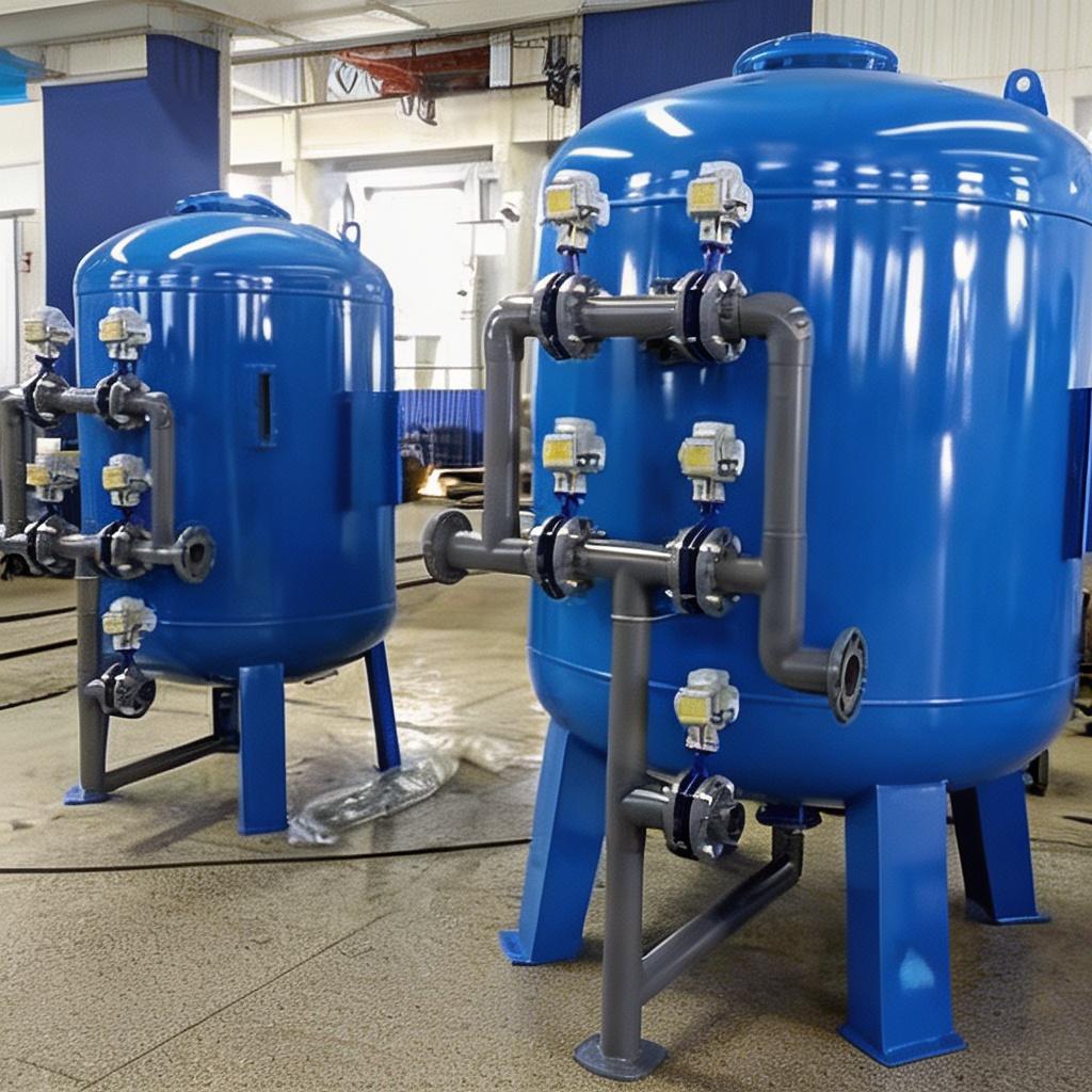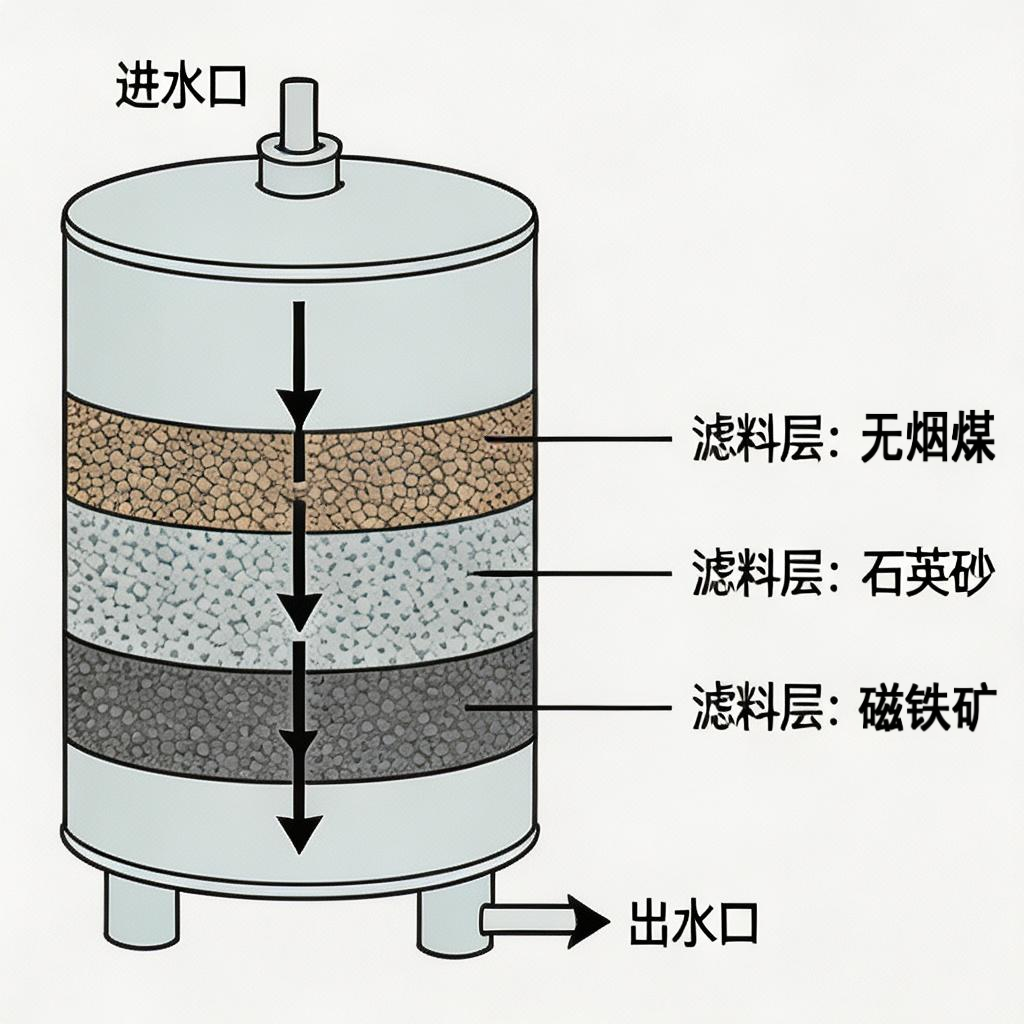 罐体内部分层填充滤料,上层为无烟煤,中层为石英砂,下层为磁铁矿,形成孔隙由上至下逐渐变小的过滤层,底部配备布水布气滤头,保证水流均匀。